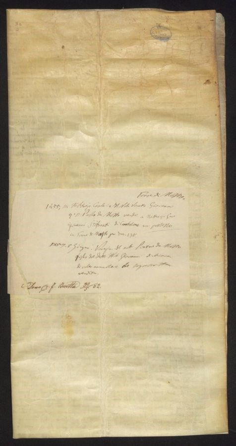 Regesto 1: Il nobile Veneto Giovanni quondam domino Paolo da Mosto vende a Matteo quondam ser Giovanni Stefanati di Corbolone un possesso in Torre di Mosto per ducati 135