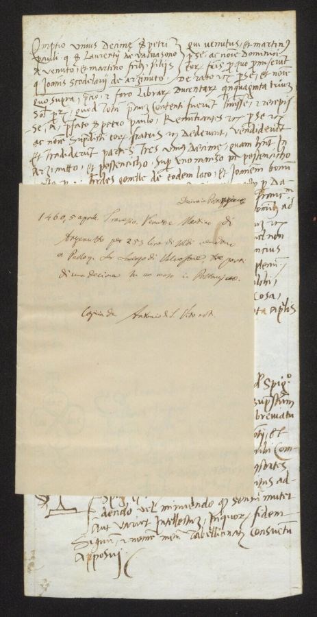 Venuto e Martino di Arzenutto per 253 lire di soldi vendono a Paolo quondam Ser Lorenzo di Valvasone, tre parti di una decima su un maso in Postongicco
