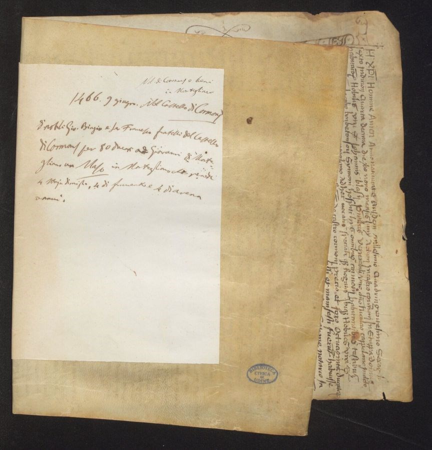 Il nobile Giovanni Biagio e Ser Francesco fratelli del Castello di Cormons per 80 ducati a Giovanni di Mortegliano un maso in Mortegliano che vende 4 staia di miglio, 4 di frumento e 4 d'avena annui