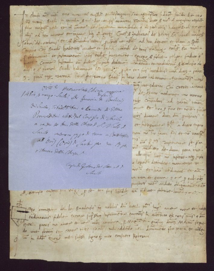 Ser Zaccaria de Bellini di Sacile, Tobia de Ottoboni e Bernardo di Ettore Provveditori eletti dal Consiglio di Sacile a vender de' beni della Chiesa di San Nicolò di Sacile, vendono un pezzo di terra a Bortolassio ab Ovi (Ovio) di Sacile per ducati 17 per ristaurare detta chiesa