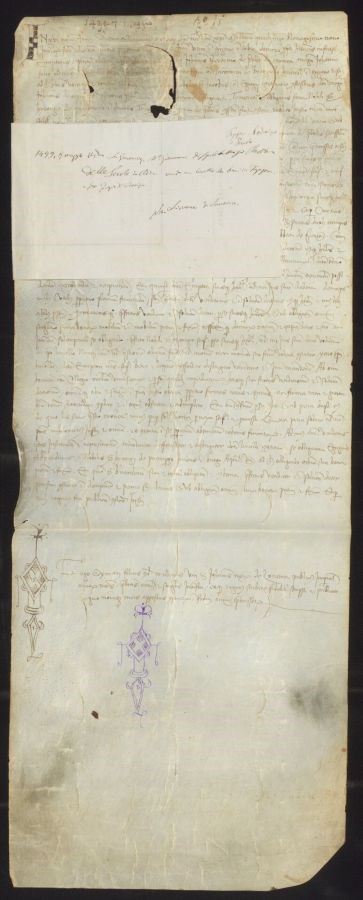 Sulla plica persistono munerosi tagli praticati per il passaggio degli attacchi di sigilli pendenti perduti