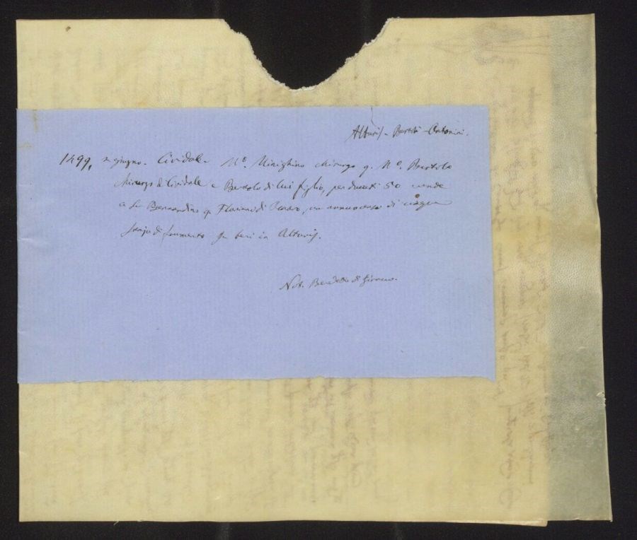 Maestro Minighino chirurgo quondam maestro Bertolo chirurgo di Cividale e Bertolo di lui figlio, per ducati 50 vende a ser Bernardino quondam Floriano di Amaro, un annuo censo di cinque staia di frumento su beni in Alturis <Alture>