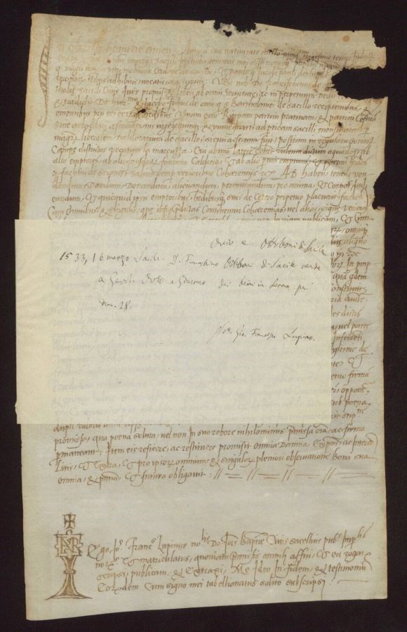Non sono stati eseguiti interventi di restauro L&39;angolo in alto a destra presenta strappi significativi, che coinvolgono anche il testo del documento