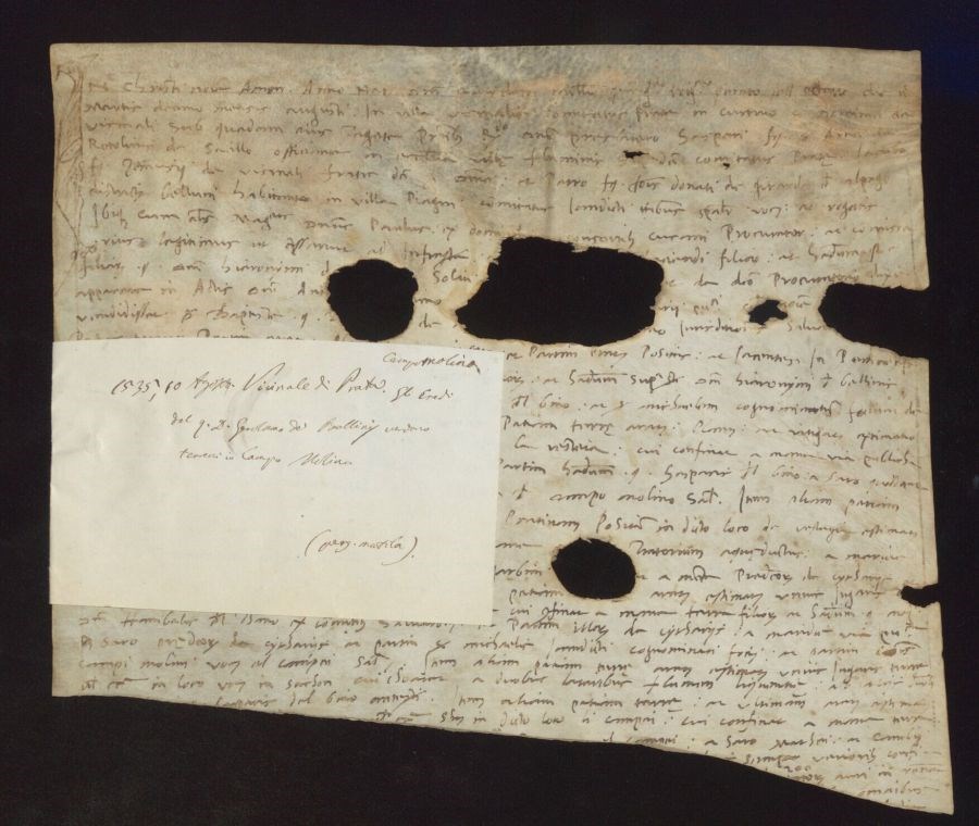 Sul cartiglio è presente l'annotazione: (perg. mutila) Non è riportato il nome di alcun notaio: lo stato della pergamena non permette di identificarlo