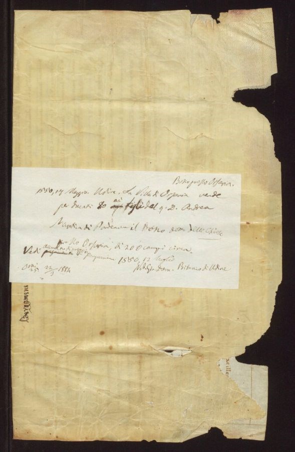 Sul cartiglio in basso ci sono delle annotazioni: Vedi aumento di prezzo in pergamena 1550, 12 luglio; cm. 25; 22/3 1884