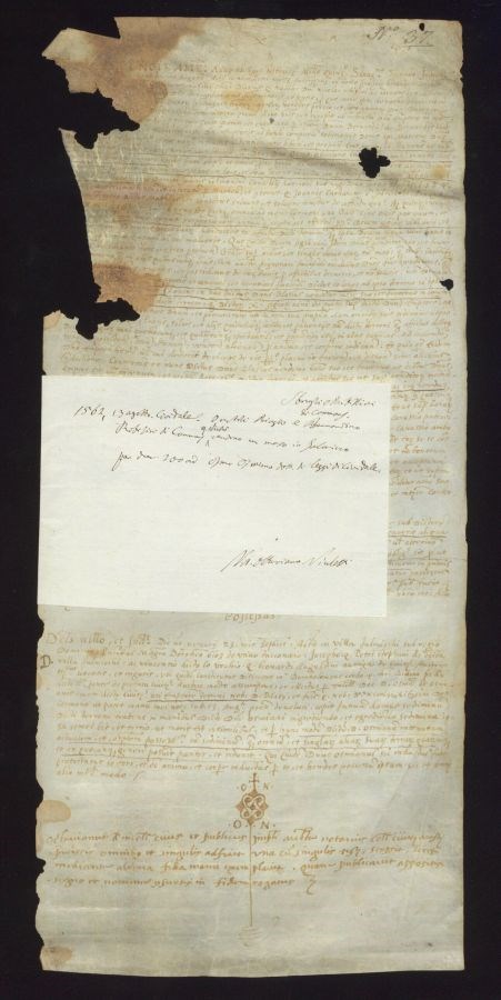 Lacerato con rosicature e gore di umidità nella parte superiore sinistra, con parziale perdita della scrittura