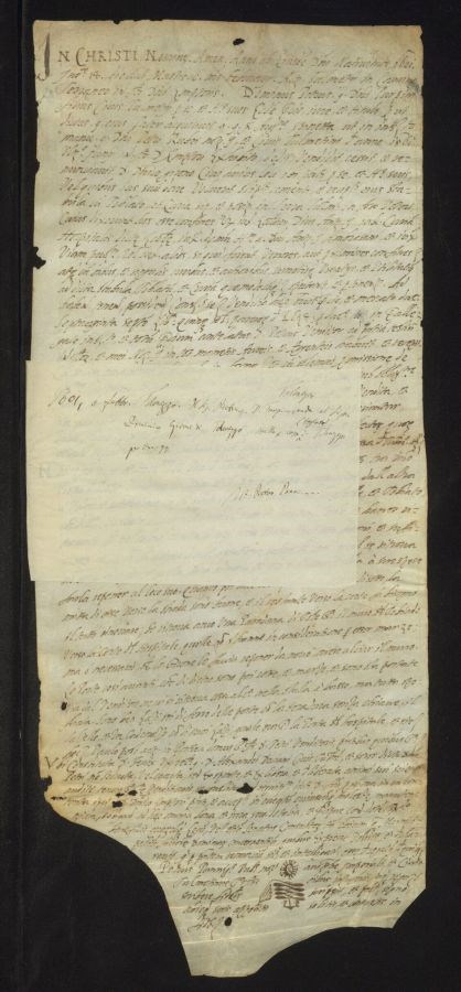 Sul cartiglio in basso il nome del notaio è incompleto: Pietro Pann[...], Dalla lettura del documento si presume che sia Pietro Panigai