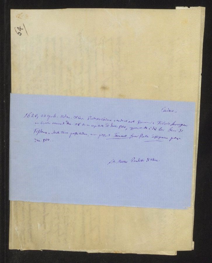 Il cavaliere Protasio Caimo vende ai nobili Giovanni e Fulvio Savorgnan un livello annnuo di di ducati 56 su un capitale di ducati 800, aggravante i di lui beni di Tissano e altre terre presso Udine, una presso Tormenet fuori porta Cussignacco per ducati 800
