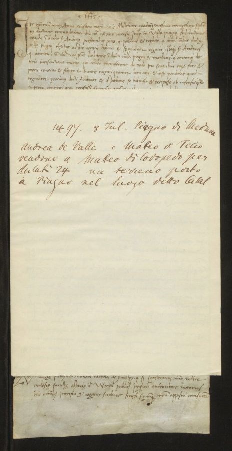 Andrea de Valle e Matteo de Tecio vendono a Matteo di Codopedo per ducati 24 un terreno posto a Piagno nel luogo detto Casal