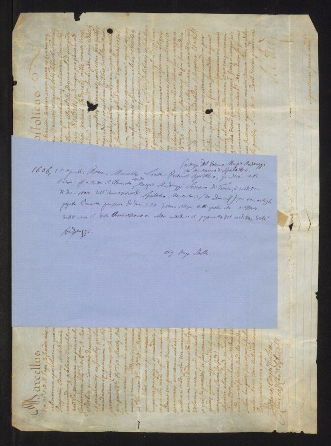 Marcello Sante protonotaio apostolico giudice etc. [scrive] a tutto il clero che essendo Marzio Andreuzzi vescovo di Trau, è creditore di ducati 1000 dell'arcivescovo di Spalatro Marcantonio (de Dominis) per non avergli pagato l'annua pensione di ducati 500, debbano obbligar tutti quelli che avessero debiti verso il detto arcivescovo a voler contribuire al pagamento del credito dell'Andreuzzi